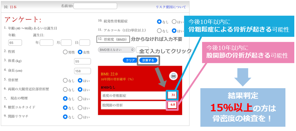 骨粗鬆症による骨折が向こう10年のうちに発生する確率が分かります。