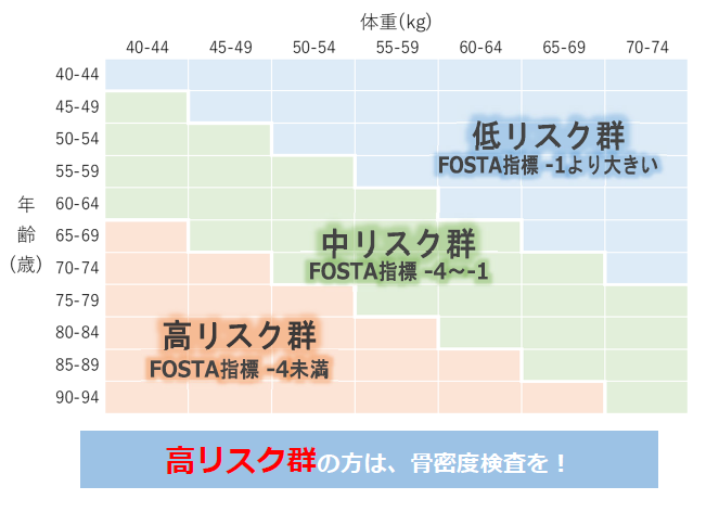 FOSTA(:Femele Osteoporosis Self assessment Tool for Asia)は、体重と年齢を組み合わせるだけで骨粗鬆症のリスクを評価できるツールです。
