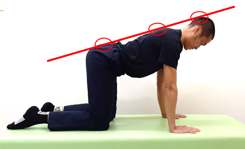 両手は肩幅で肩の真下に置き、また、両膝は股関節(両腿の付け根)の下に置いて四つ這いになります。