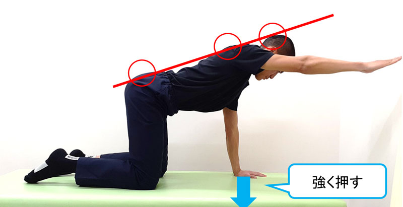 片手を前方に伸ばす直前に、マットに着いてる手で強くマットを押すとせぼねが安定します。