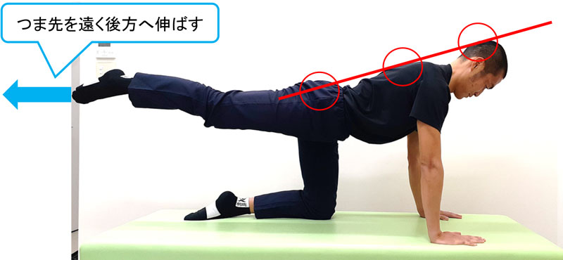 つま先が遠く後方へ伸びていないと腰が反ってしまい、腰に負担がかかります。
