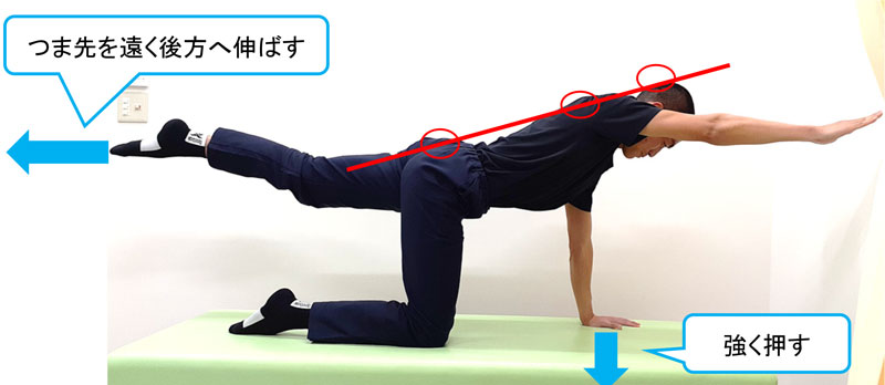 ※片手を前方に伸ばすした時に骨盤、背中、後頭部が一直線の状態を保ち、せぼねを安定させましょう。