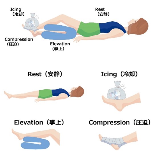 1度捻挫と2度捻挫では、応急処置の基本とRICE処置を行います。